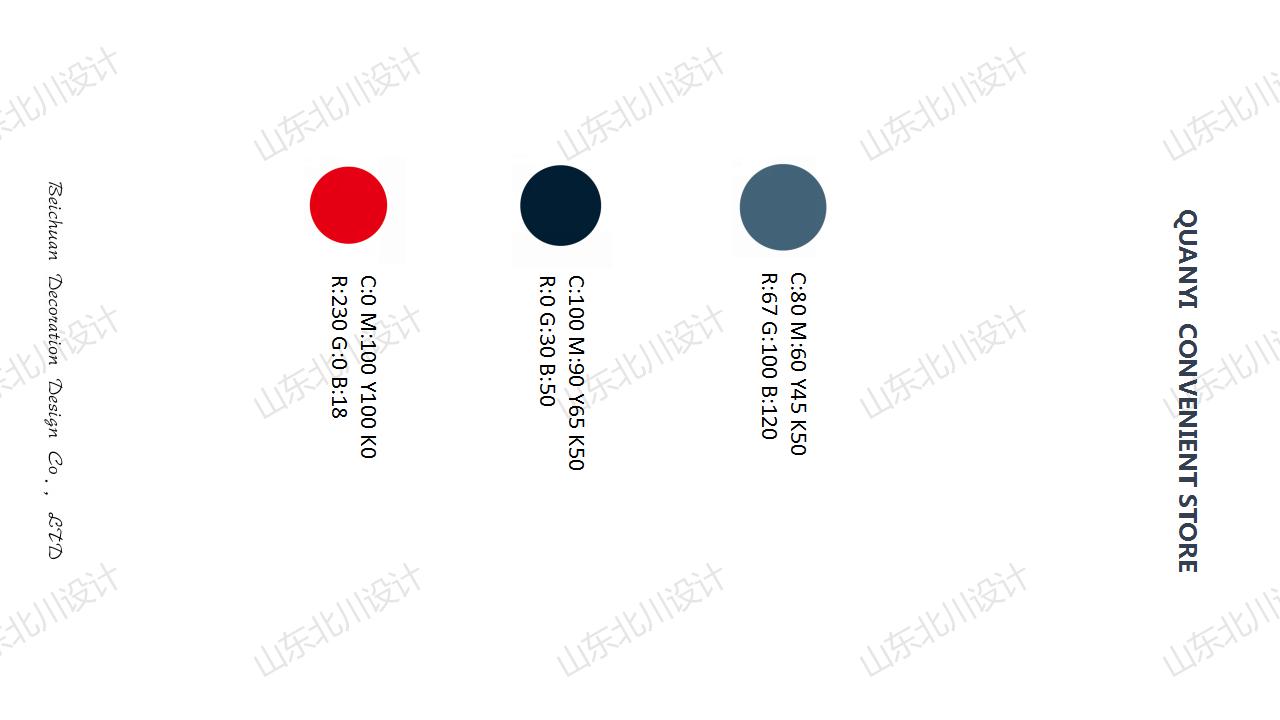 三、裝修色彩定位:超市客群以幼兒和小學生為主,故裝修色彩定位為較為鮮艷的紅色為主題色,以較為穩重的青色藏青色為輔助色,黑白灰等無色系為基礎色調。形成穩重又不乏靈活和對比的視覺感受;